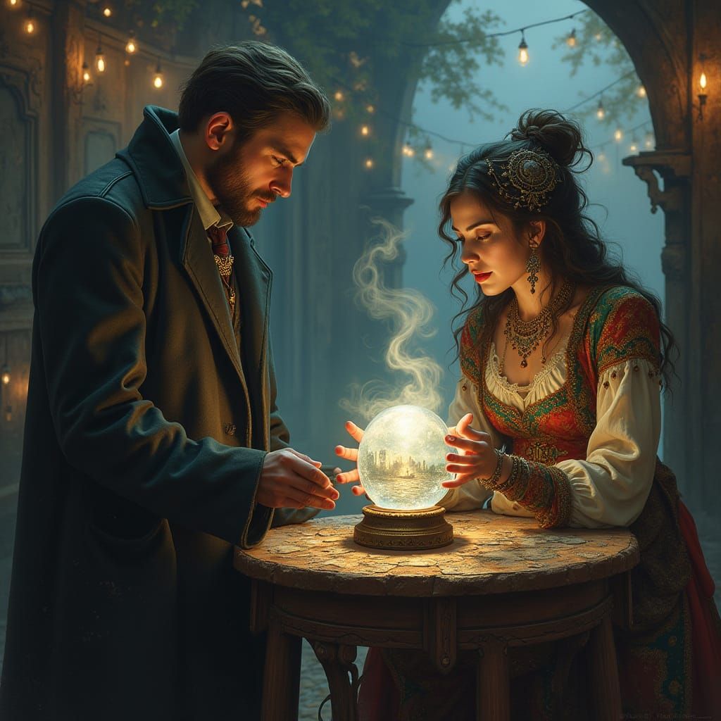 This image depicts a young Russian man in a worn coat, seeking guidance from a mystical gypsy woman in a fortune teller's saloon. The atmosphere is foreboding, with a war-torn landscape unfolding in the crystal ball, amidst grey smoke and dark, muted colors.