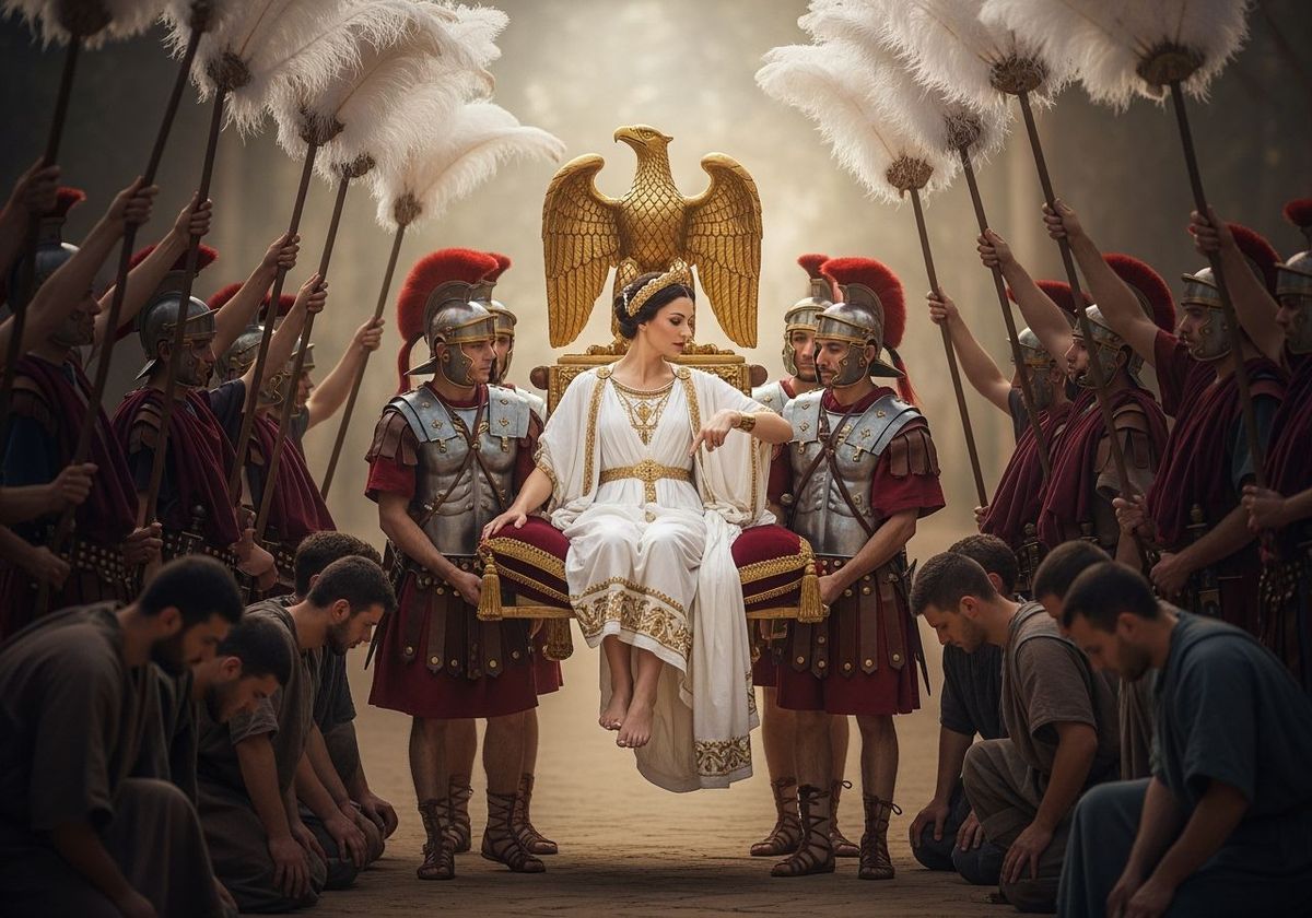 This image shows a Roman Empress being carried on a golden throne shaped like an imperial eagle. The scene, reminiscent of classical realism, is rich in detail and texture, enhanced by soft bokeh.