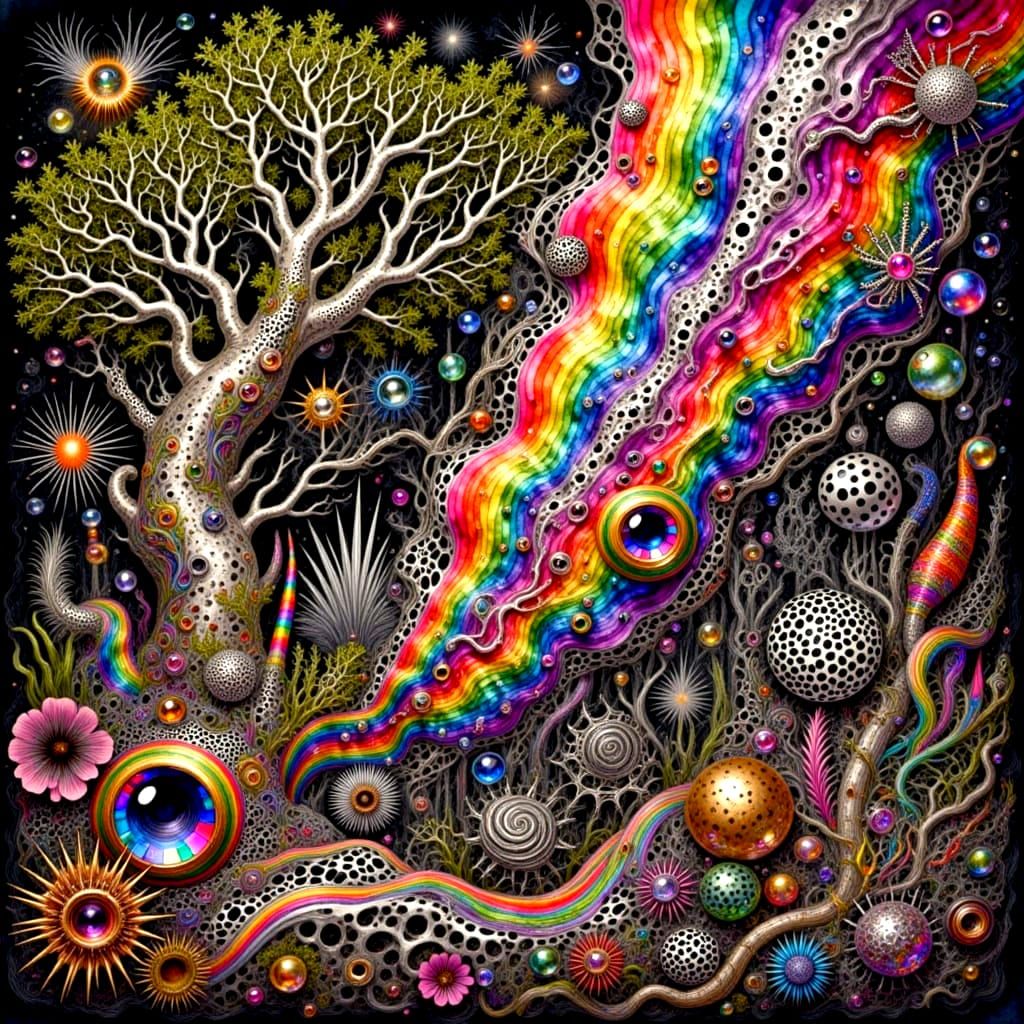 This image visualizes the intricate beauty of the microbial universe, blending botanical elements with luminous particles and ethereal haze, creating a complex, fragmented, and otherworldly collage.