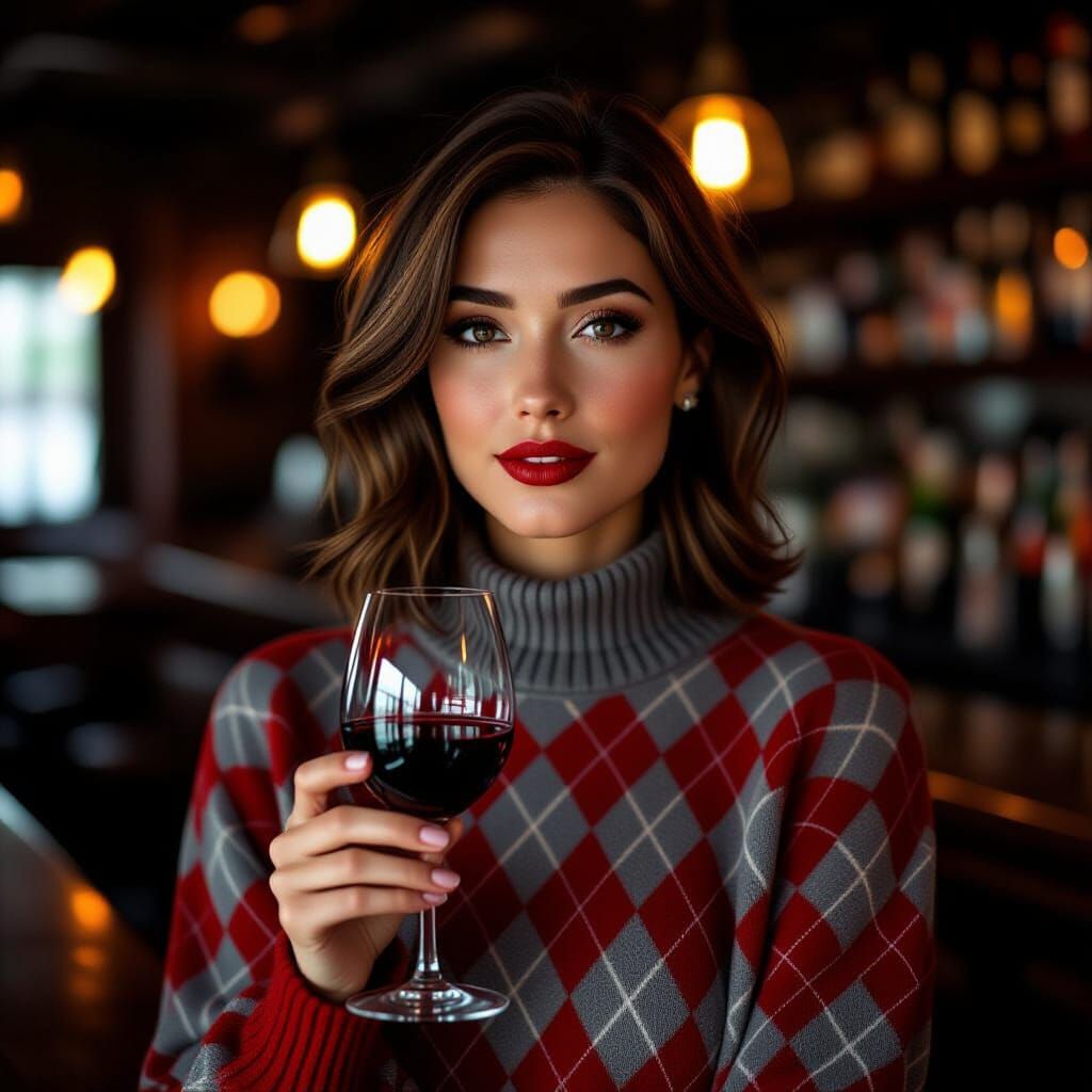 This photorealistic image shows a brunette woman with a bob haircut in a red and gray argyle sweaterdress, holding wine in a bar with cinematic lighting and a shallow depth of field.