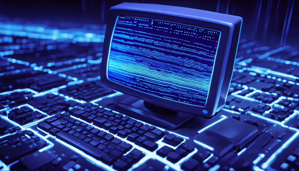 This image shows the Windows XP wallpaper in a retro digital art style. The close-up macro shot features pixel art, glowing blue lines and flickering scanlines with a warm monitor glow.