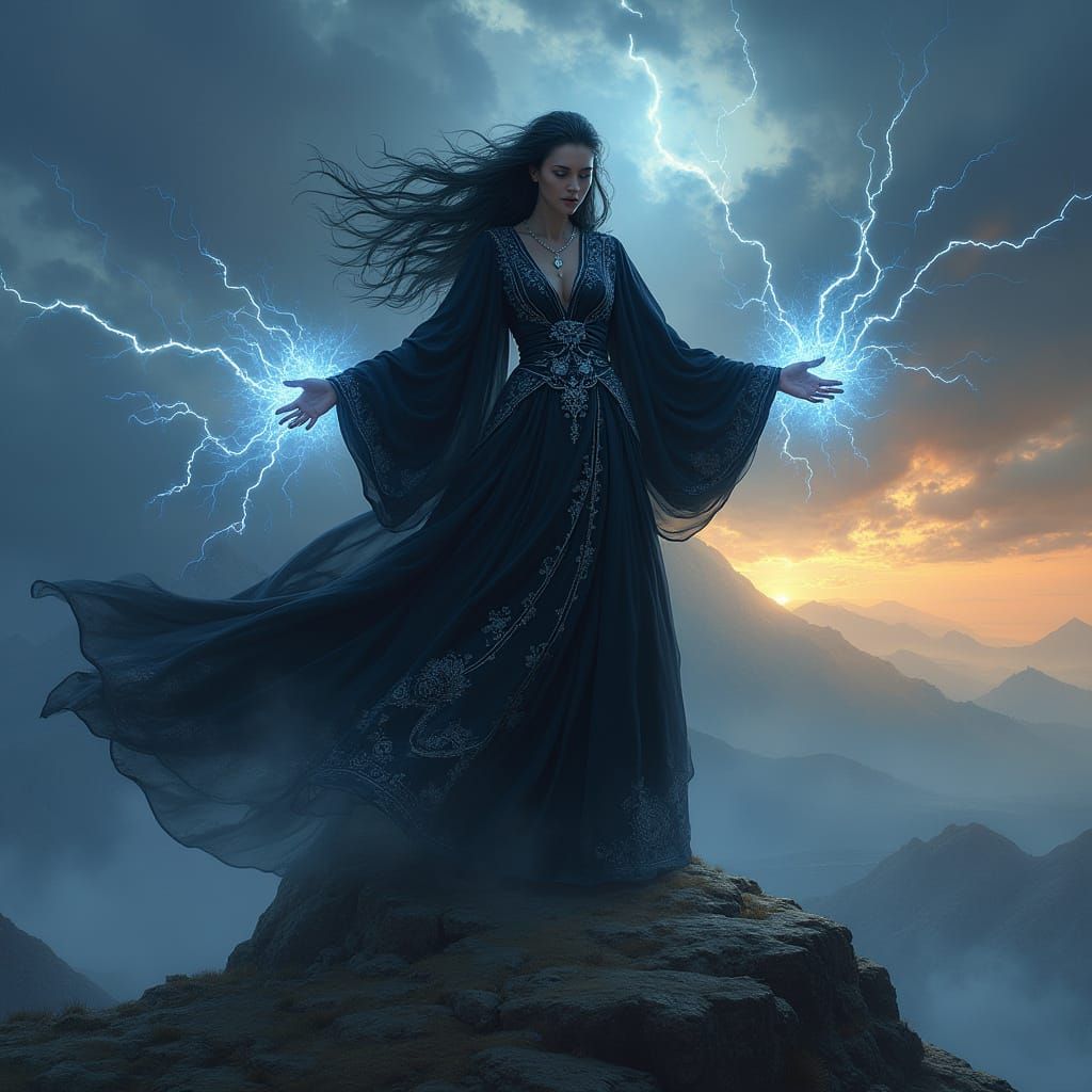 A powerful sorceress stands atop a mountain peak, her black robes and raven-black hair flowing in the wind as she channels elemental energy. Etched symbols on her hands and forehead glow with a soft blue light, set against a turbulent sky with lightning illuminating dark clouds in electric flashes.