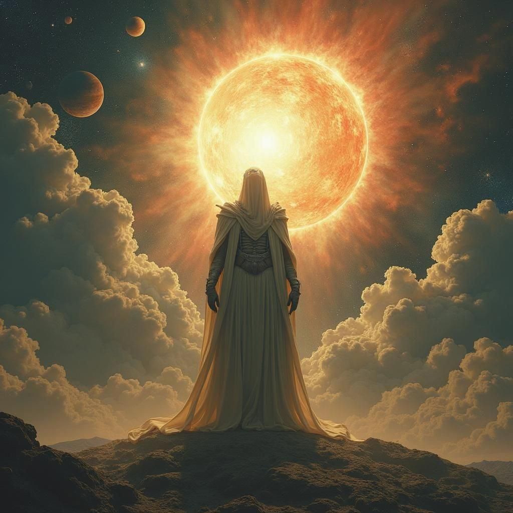 This image depicts the creation of our solar system. The scene is rendered in a brutalist architectural style with dramatic backlighting.