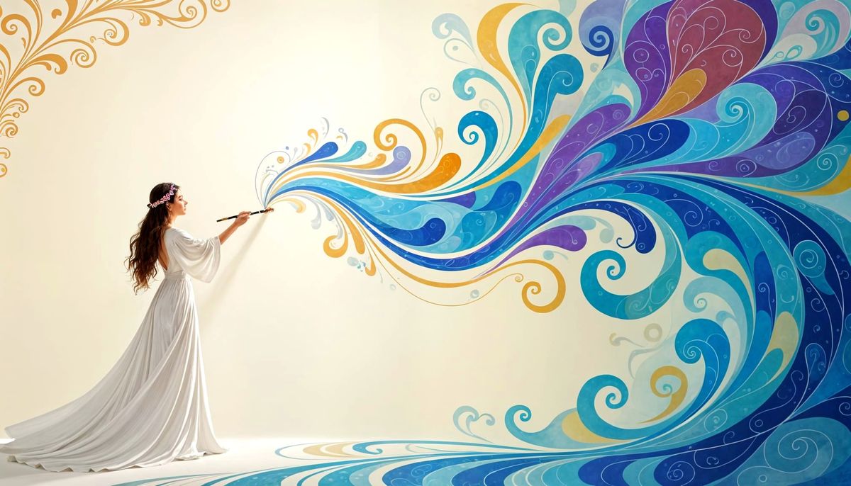 This image depicts a graceful artist painting vibrant, flowing curls of color onto a cream wall. The artwork showcases the artist's emotions through dynamic patterns and expressive brushwork.