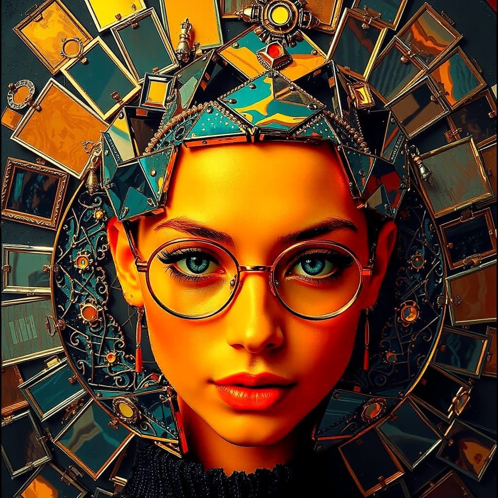 This image shows a dazzling array of geometric shapes reflected in shiny mirrors, with a kaleidoscope of vibrant colors creating a mesmerizing visual effect.