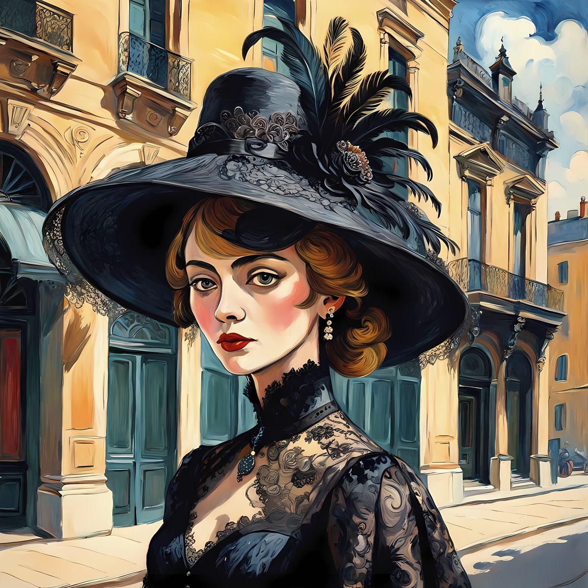 This image depicts a striking woman in a lavish black lace dress and feathered hat, set against a historic backdrop. The artwork showcases rich colors and intricate details, blending Post-Impressionist techniques with Gouache style and Impasto textures.