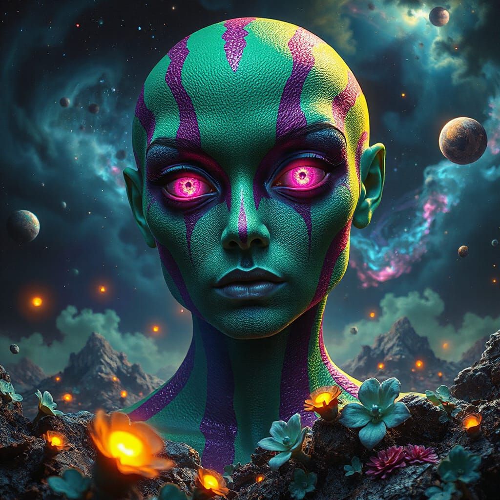 This image shows a colossal woman with green skin and purple stripes, her powerful eyes gazing out over a surreal, dreamlike vista. The scene features dramatic lighting, cosmic elements, and a wide-angle perspective, rendered with otherworldly textures and atmospheric depth.