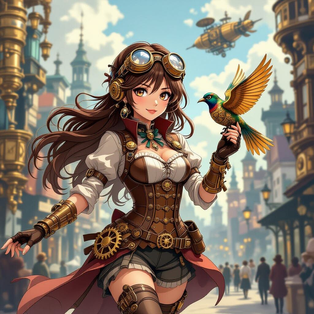This image depicts a semi-realistic anime woman in a steampunk style, adorned with clockwork accessories and goggles. She runs through a Victorian city with a mechanical bird, set against brass structures and airships.