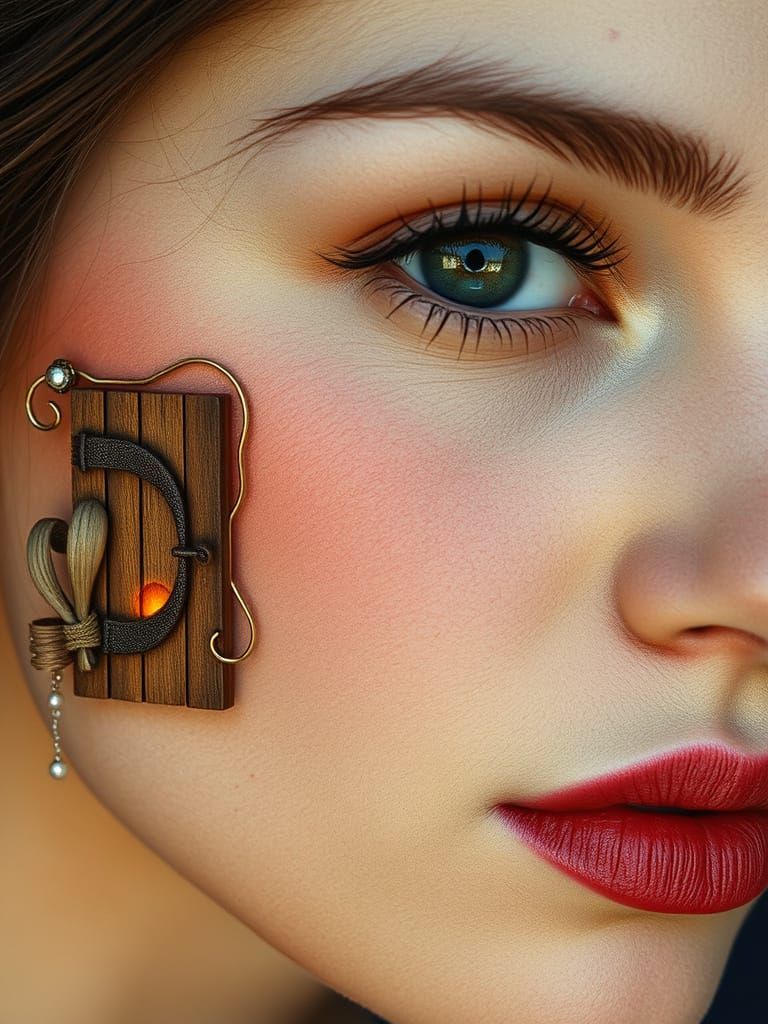 A surreal portrait of a woman's face features a tiny wooden door. The whimsical image, reminiscent of pop surrealism, includes vibrant resin detailing and a glimpse of a sunset mountain scene.