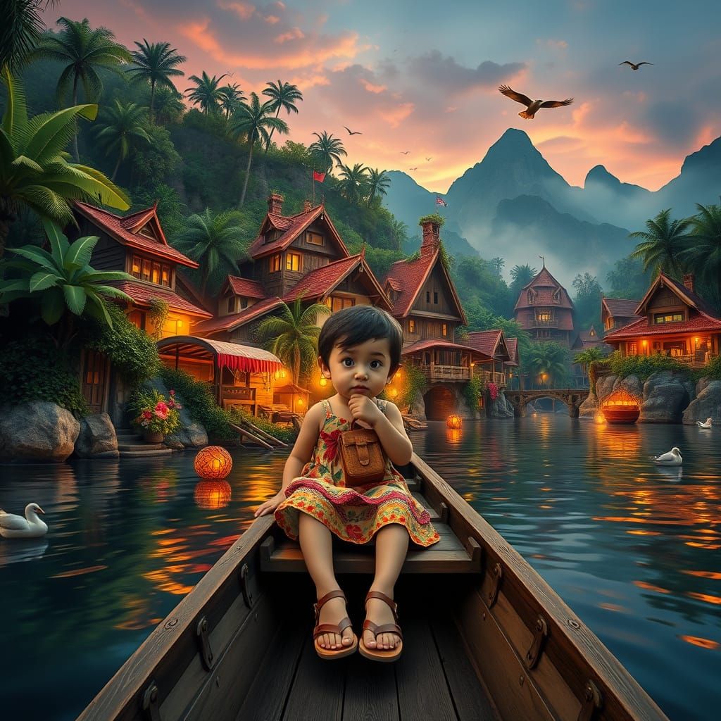 A magical fantasy town nestled in a lush tropical valley, colorful wooden and stone houses with terracotta roofs, palm trees and flowering vines lining the riverbanks, glowing lanterns starting to light as the sky turns shades of coral and gold, a small wooden boat drifting gently toward the town, with ...