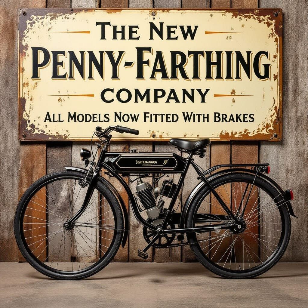 This image shows a vintage penny farthing bicycle retrofitted with an electric motor. The design blends steampunk and industrial elements, set against a rustic backdrop. A faded sign adds to the distressed aesthetic.