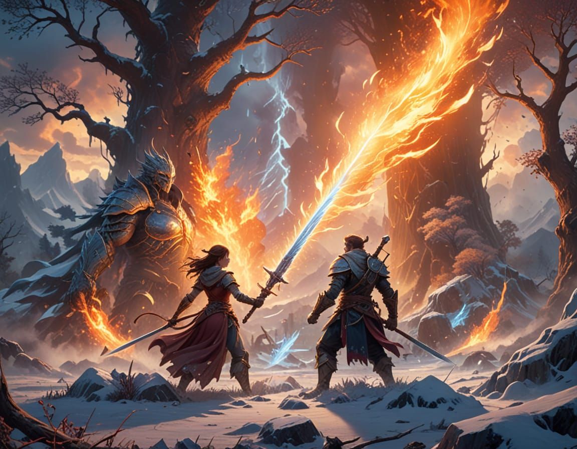 This image shows a breathtaking fantasy scene of a woman and man clashing in a war-torn field, surrounded by trees ablaze or frozen in ice. The artwork features vibrant, cel-shaded textures and dynamic lighting, blending warm and cool colors in a stunning display of elemental energy.