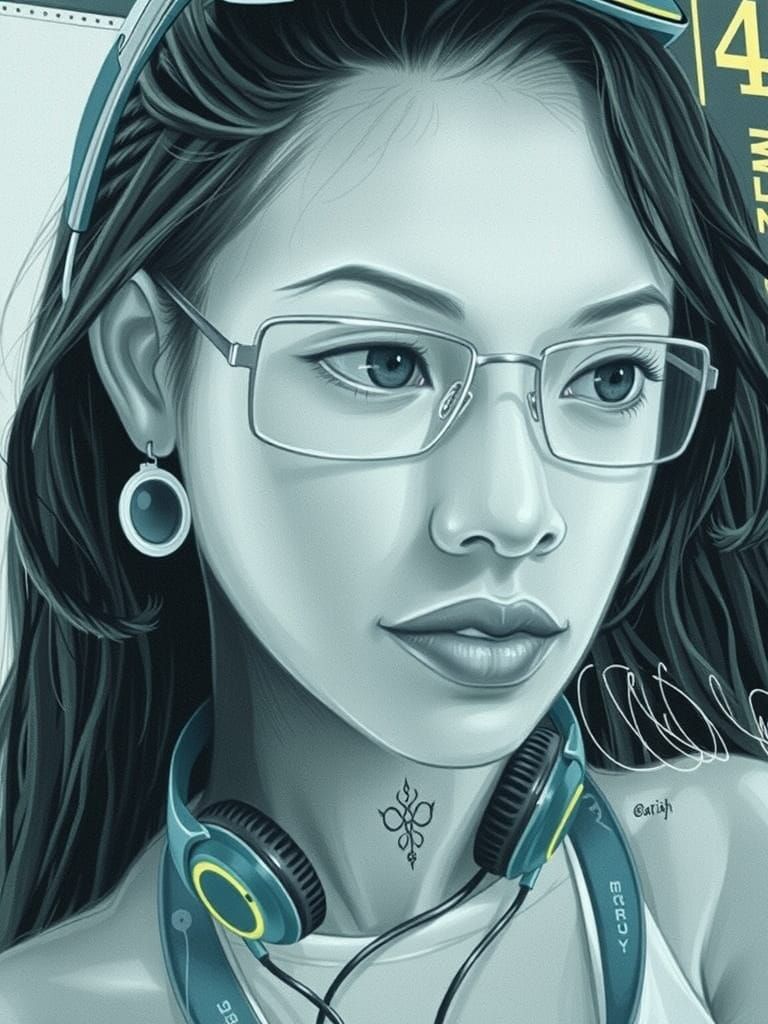 This portrait showcases an African woman's serene expression, adorned with vibrant electric blue headphones and sleek sunglasses, set against a backdrop of her intricately braided hair and delicate tribal tattoo. The artwork combines elements of urban chic and fantasy, reflecting a unique blend of styles...