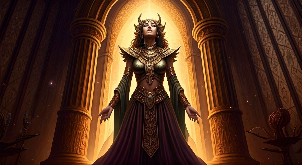 A striking picture of a sorceress in a spire, surrounded by mystical artifacts. The image features a blend of fantasy and ancient mythology, with a rich color palette in a dramatic fantasy style.