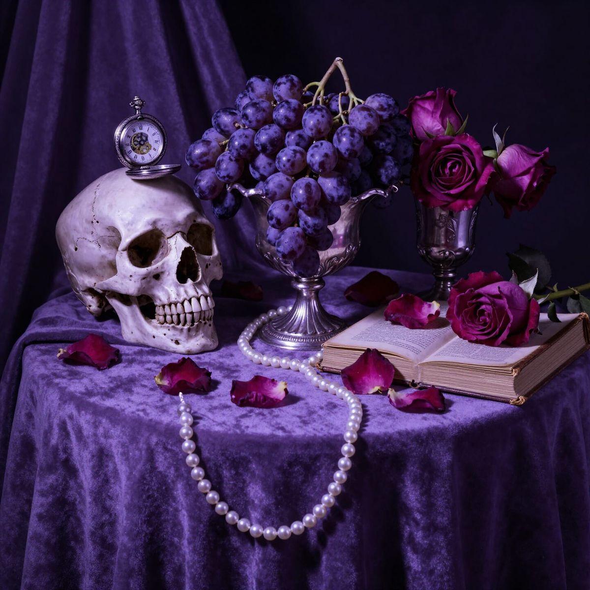 This image showcases a monochromatic Baroque still life in shades of purple. It features a skull, grapes, a pocket watch, wilting roses, and a book, all rendered with dramatic lighting and rich detail.