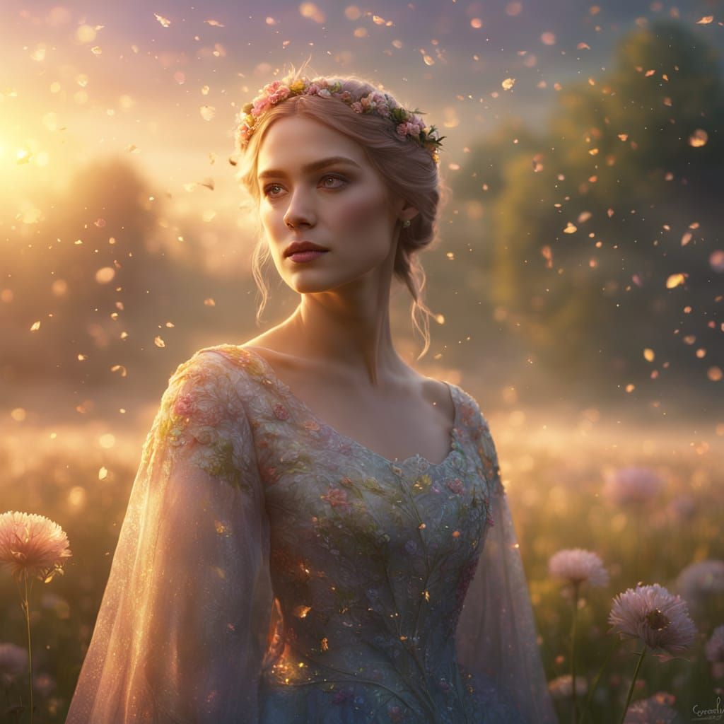A hyperdetailed portrait of a woman in a misty meadow at sunrise. Soft, glowing petals surround her as she wears a shimmering pastel gown. Golden light illuminates the scene in a fantasy realism style.