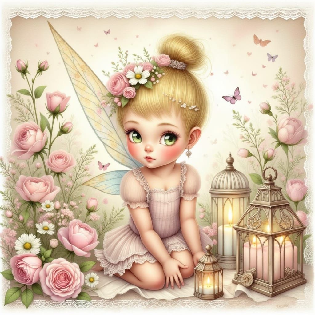 This image features Tinker Bell in a boho shabby chic style, rendered with soft watercolor and mixed-media techniques. The artwork has a romantic, fine-art feel with a pastel color palette and vintage textures.