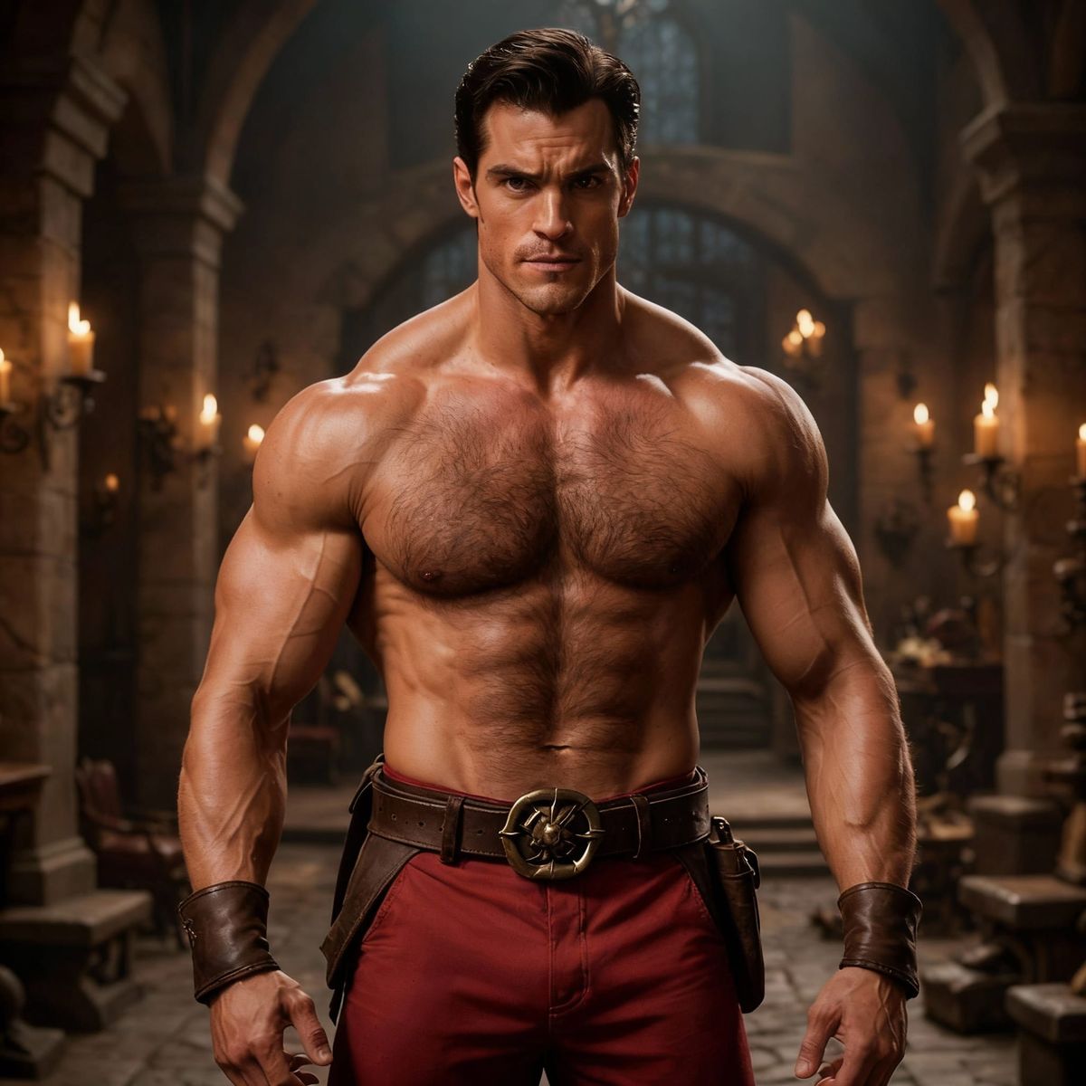 This image shows a photorealistic depiction of Gaston from Beauty and the Beast, flexing his muscles in a rustic medieval pub. He has a cocky grin and is dressed in breeches and boots.