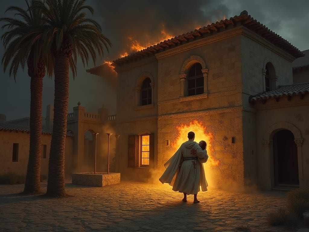 This image shows a dramatic 12th-century Palestinian night scene, reminiscent of Old Masters. A grand mansion burns, casting flickering shadows, while a young Templar Knight emerges, carrying a woman, amidst a backdrop of dark skies and palm trees.