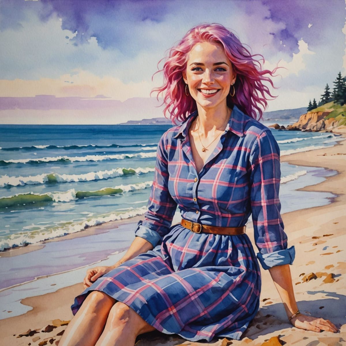 This image showcases a smiling pink-haired woman with an hourglass figure sitting on a beach. Rendered in a textured watercolor and gouache style with thick brush strokes.
