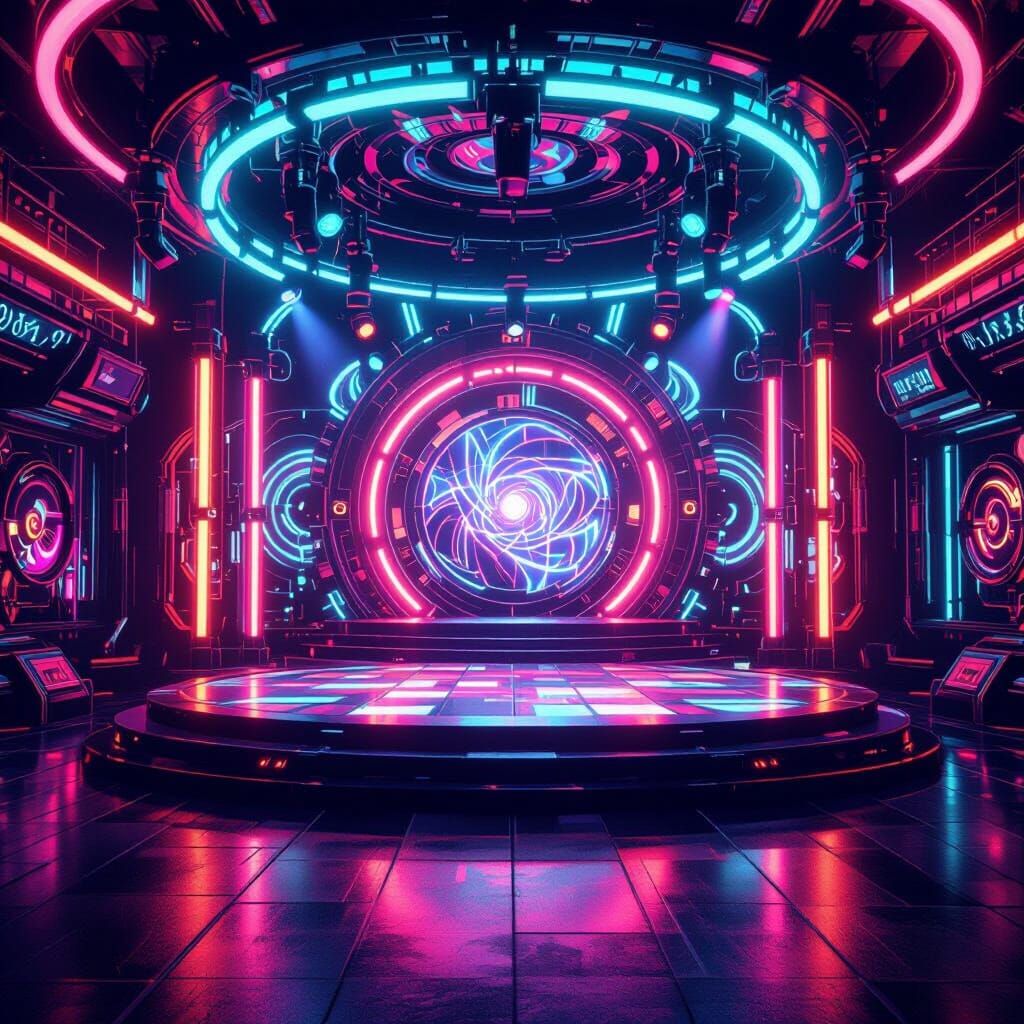 A vivid disco club stage bathed in flashing lights and glowing neon. Intricate swirling patterns enhance the fantasy setting, rendered as a detailed matte painting with rich colors and cinematic quality.