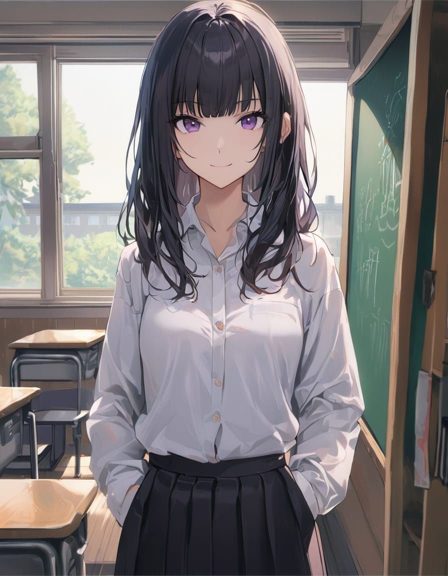 This image shows a young girl standing confidently in a classroom, wearing a white shirt and black skirt, with a light smile and striking purple eyes. The scene is set indoors, with a chalkboard in the background, capturing a moment of quiet introspection.