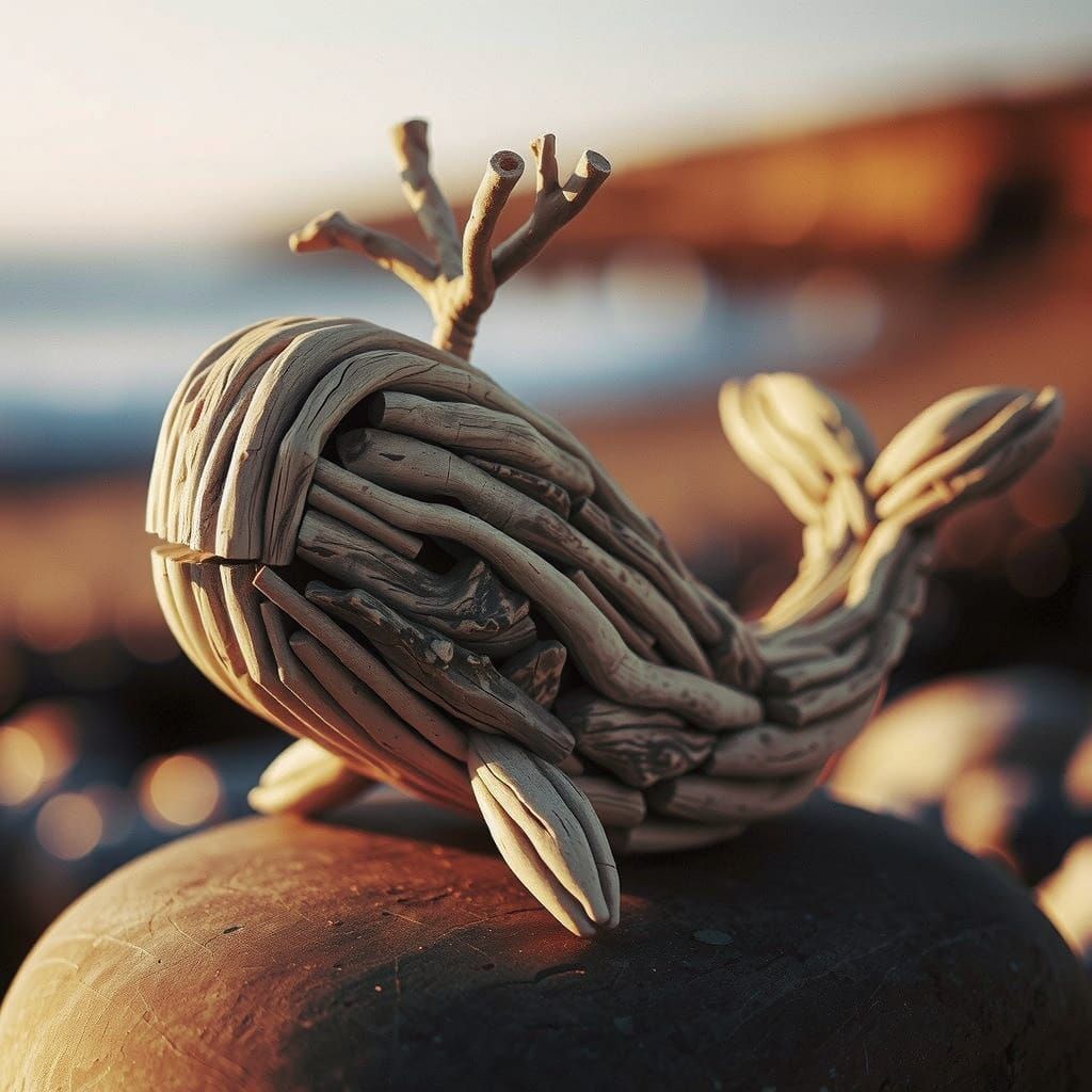 This image shows a driftwood whale sculpture pieced together from weathered wood. The sculpture sits on a rock near the sea, illuminated by soft, golden light. The naturalistic style emphasizes organic forms.
