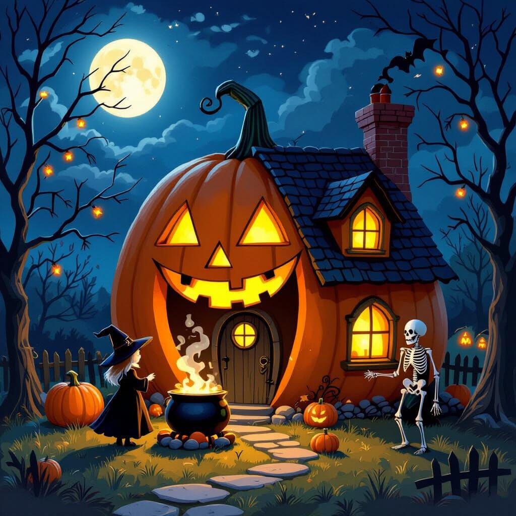 This image depicts a charming pumpkin house at night, with its mouth as the door and windows as eyes, lit by Halloween lights and moonlight. A witch and skeleton are nearby with a cauldron, in a storybook illustration style.