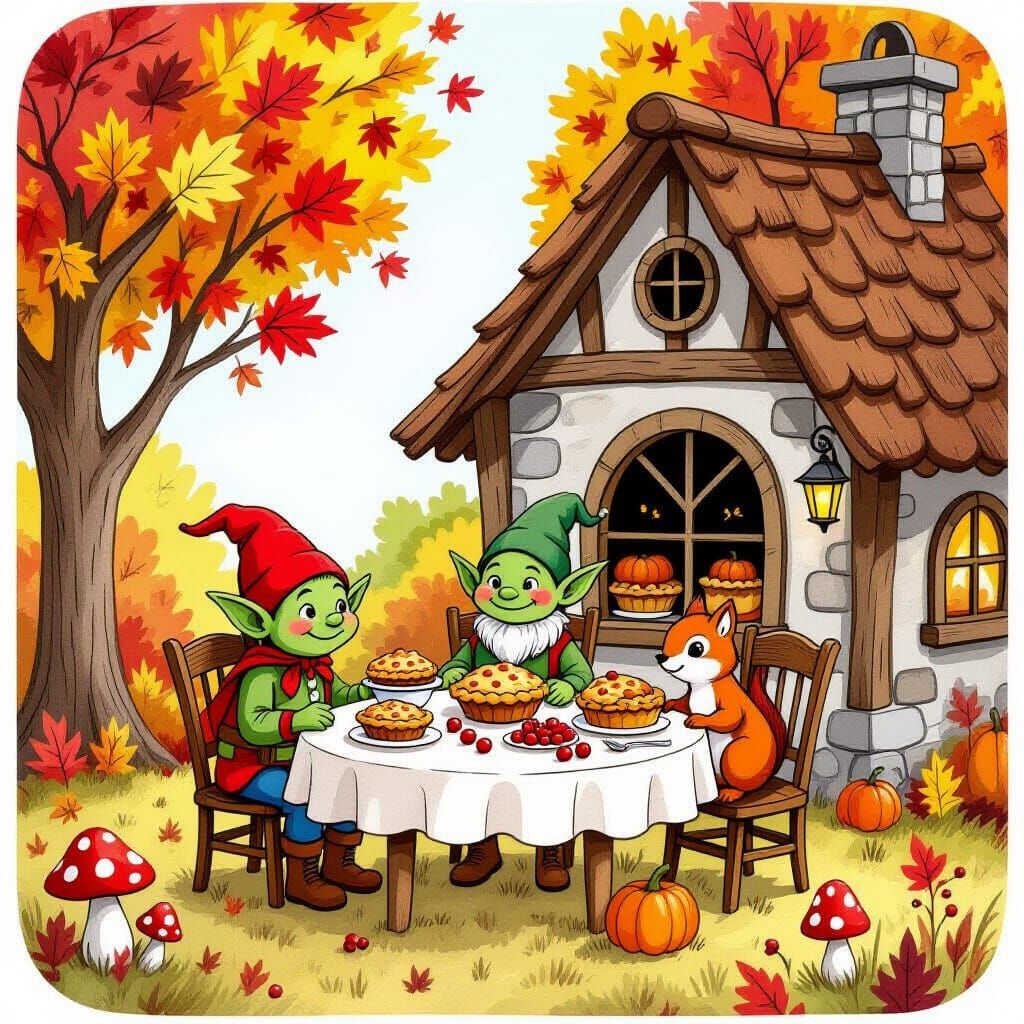 "Goblin Thanksgiving Feast" A cozy, rustic cottage nestled amongst autumn trees. Leaves are in shades of red, orange, yellow, and brown. A ...