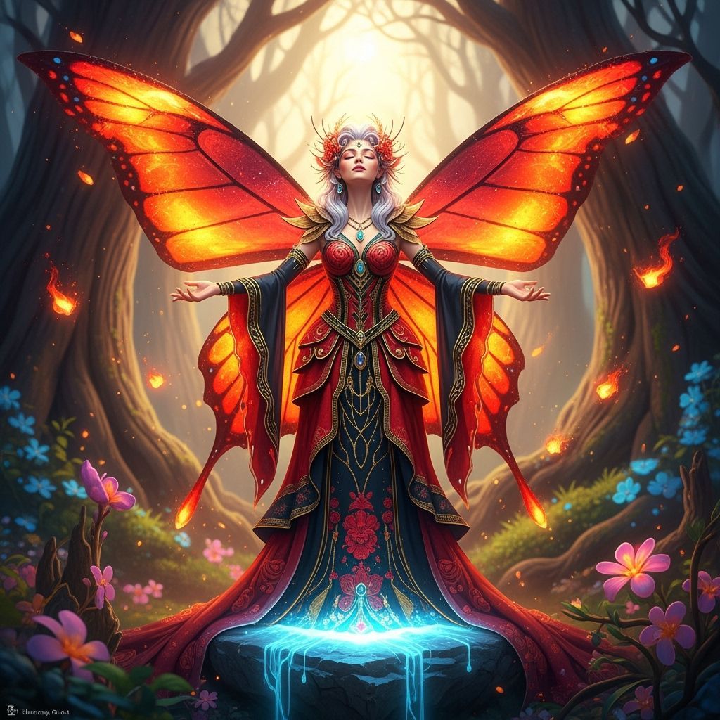 A captivating image of a fairy queen on a rock pedestal in an enchanted forest. The cinematic high fantasy style uses dreamlike glows and dramatic lighting to highlight her butterfly wings.