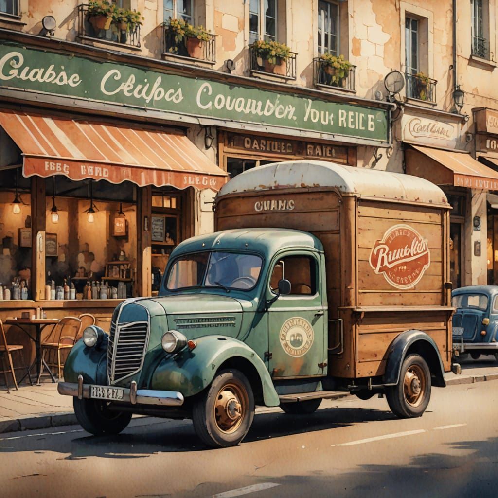This charming watercolor illustration captures a vintage beer truck parked in a quaint French cafe, with soft brushstrokes and warm lighting, evoking a sense of classic nostalgia and rustic charm.