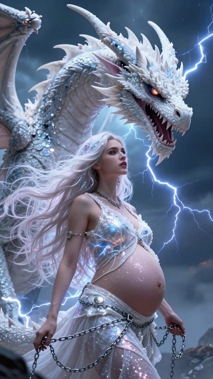 A dramatic fantasy art scene shows a pregnant woman with flowing glitter hair controlling a menacing dragon crackling with lightning. Rendered with dynamic lighting and vibrant colors.
