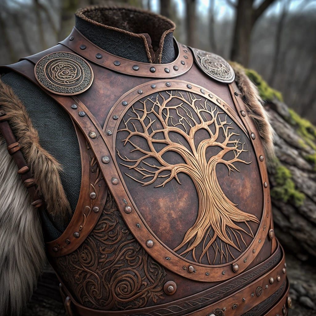 A photorealistic image of a Norse leather breastplate featuring an elaborate pyrography engraving of Yggdrasil, the Norse Tree of Life. The handcrafted armour shows signs of wear and rests on a workbench.