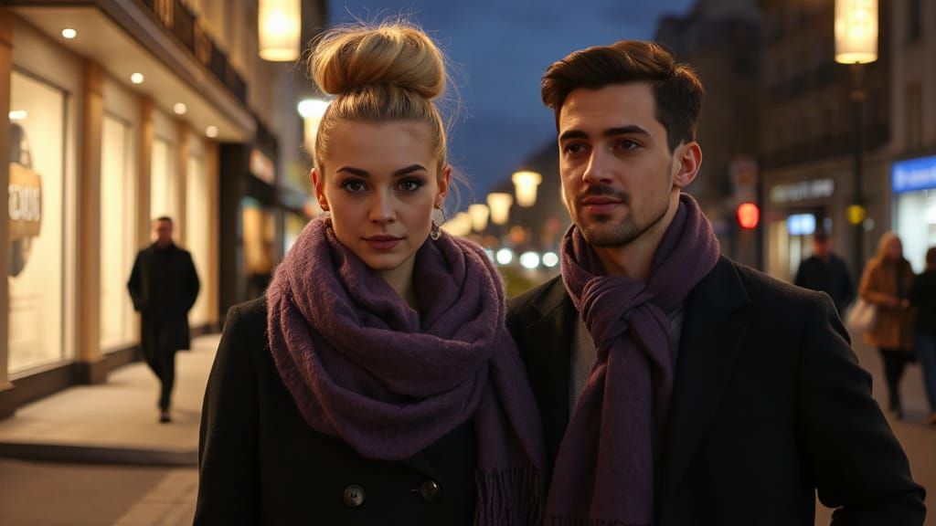 Night in Paris, automn. Blond young woman with beautiful make-up, purple coat, long wool scarf and wonderful bun is walking next to a french parisian young man friend, on the sidewalk of Champs-Elysées. Beautiful light. Cinematic 8K, intricate details, HDR, beautifully shot, hyperrealistic, sharp focus, ...
