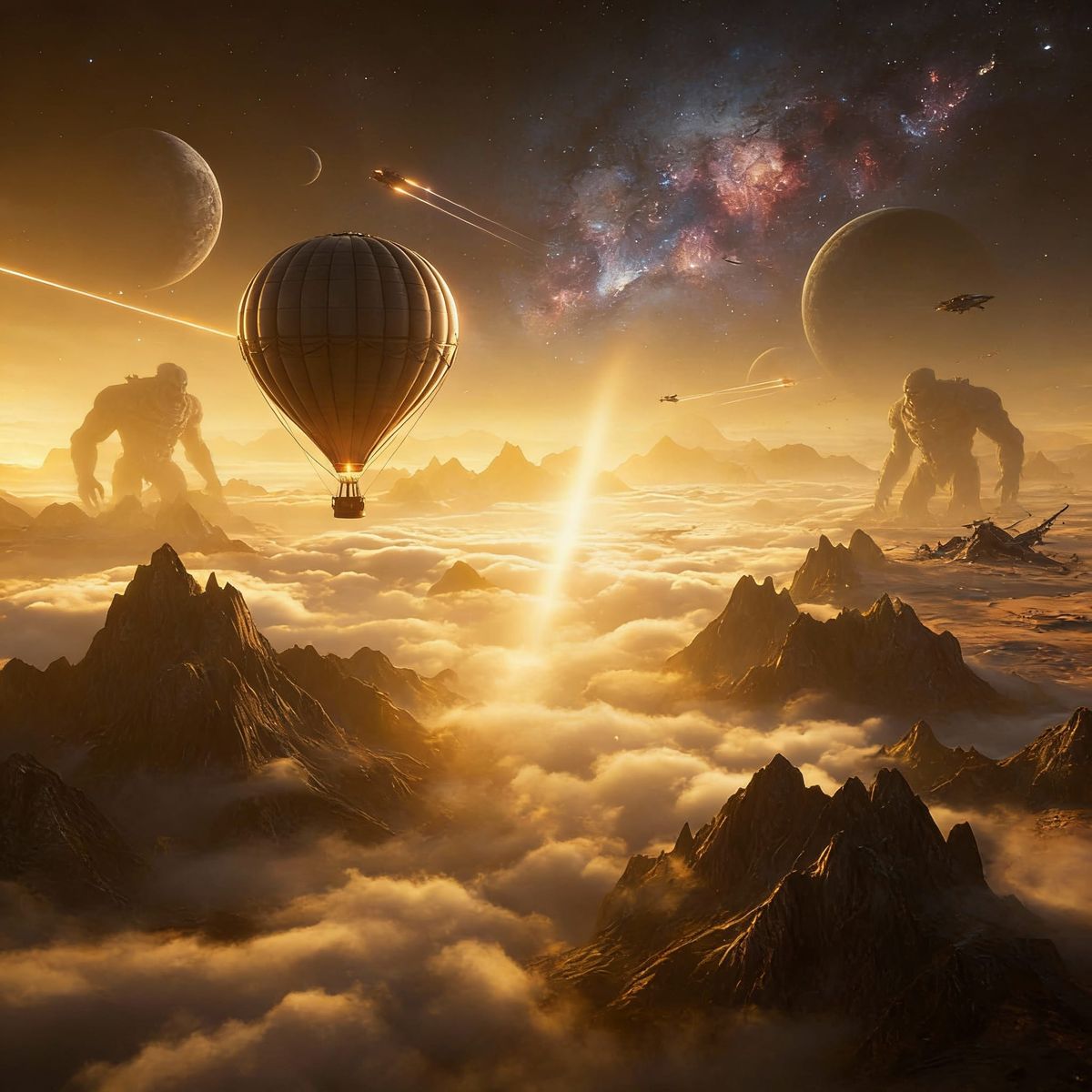 A photorealistic sci-fi scene where a hot air balloon drifts through ethereal clouds, pursued by colossal figures and trailing wreckage, evoking ancient tragedy.