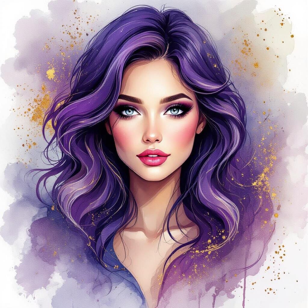 This image shows a beautiful woman depicted in flowing purple, white, and gold tones. The artwork features a watercolor and ink splash effect, complete with golden swirls and speckles, in an ethereal style.