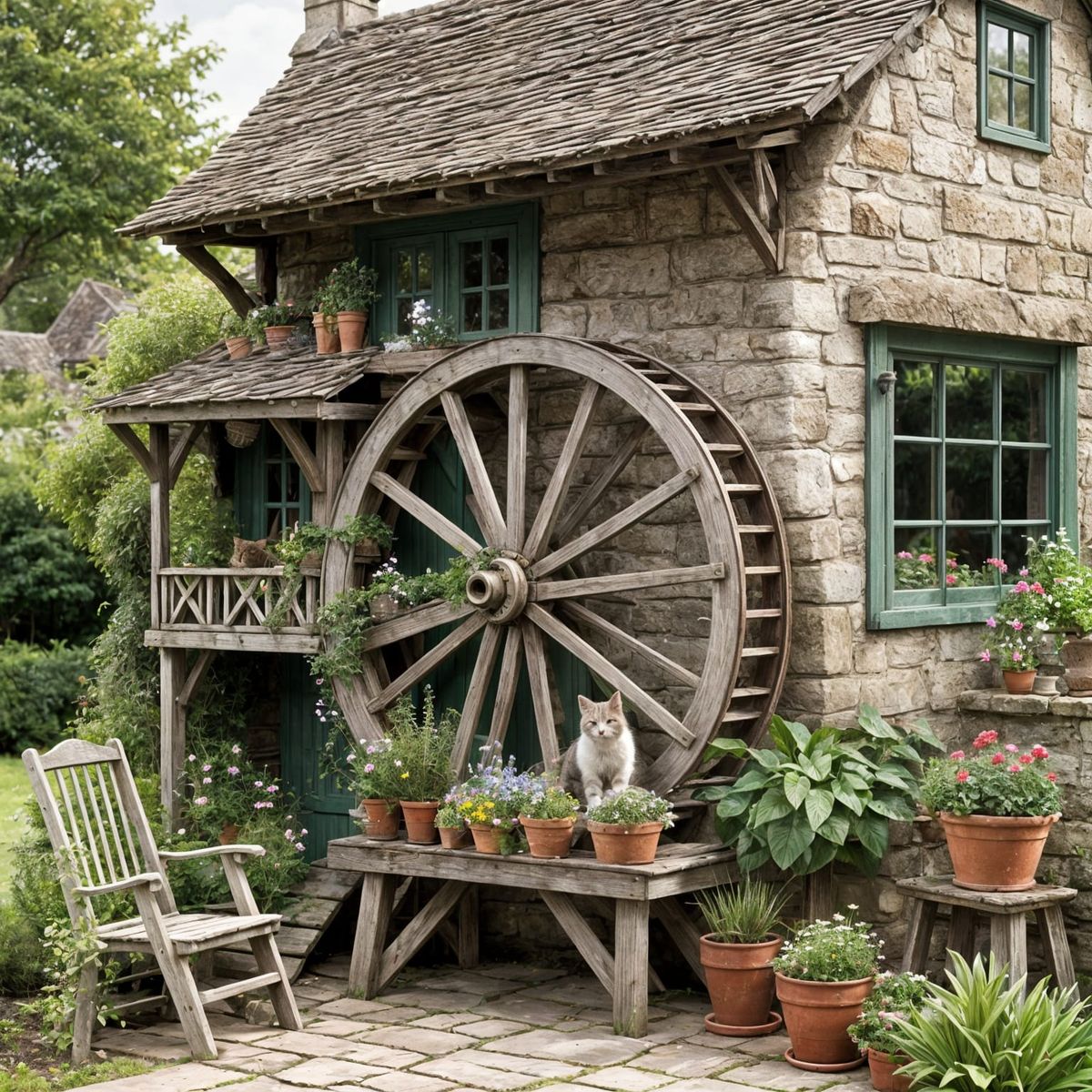 A rustic ornate waterwheel being used as a plant stand beside a country cottage , a cat sat on the doorstep