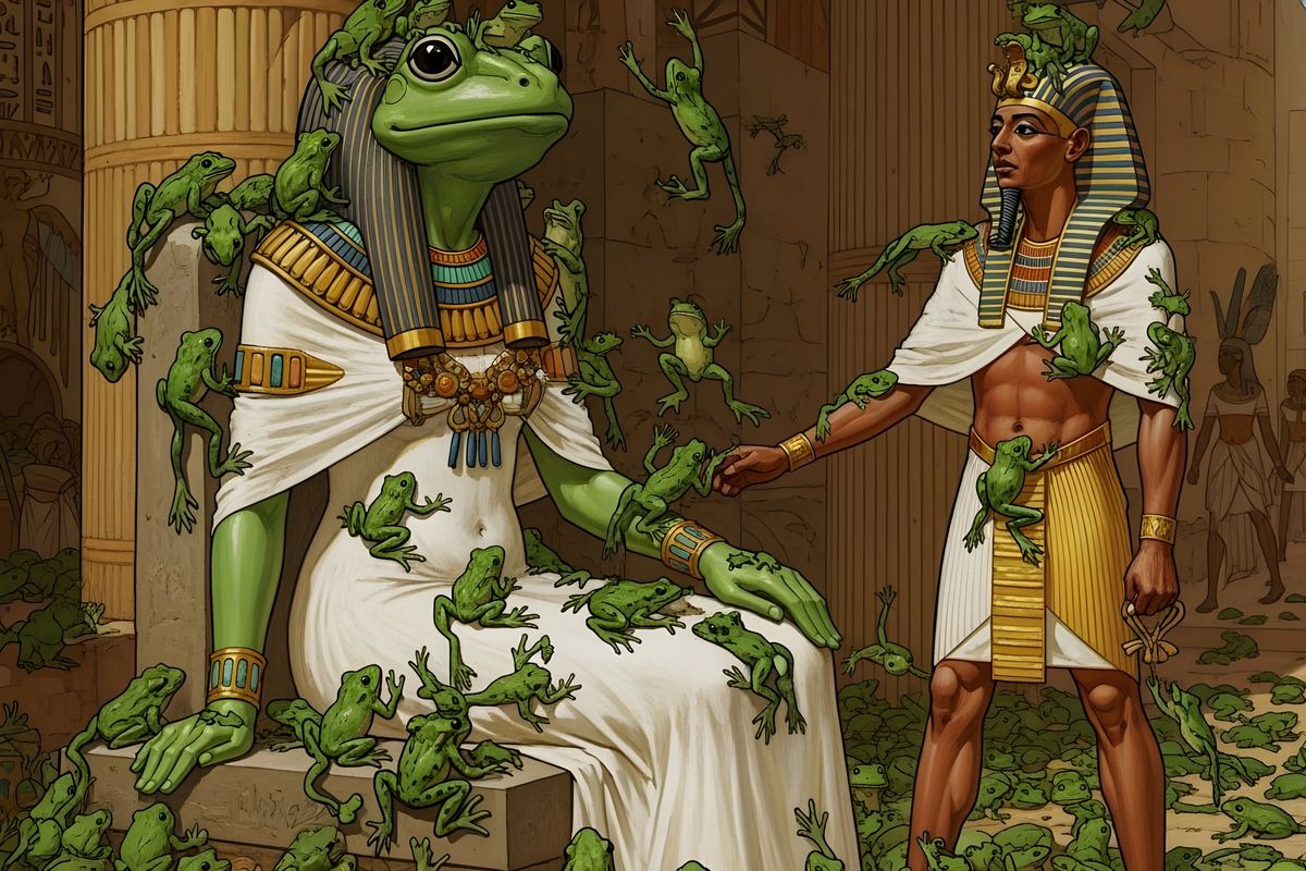 A depiction of the Egyptian goddess Heqet with a pharaoh amid a frog swarm, set within the Temple of Luxor. The art style evokes the elegance of Ingres, Mucha's detail, and Klimt's vibrant colors.