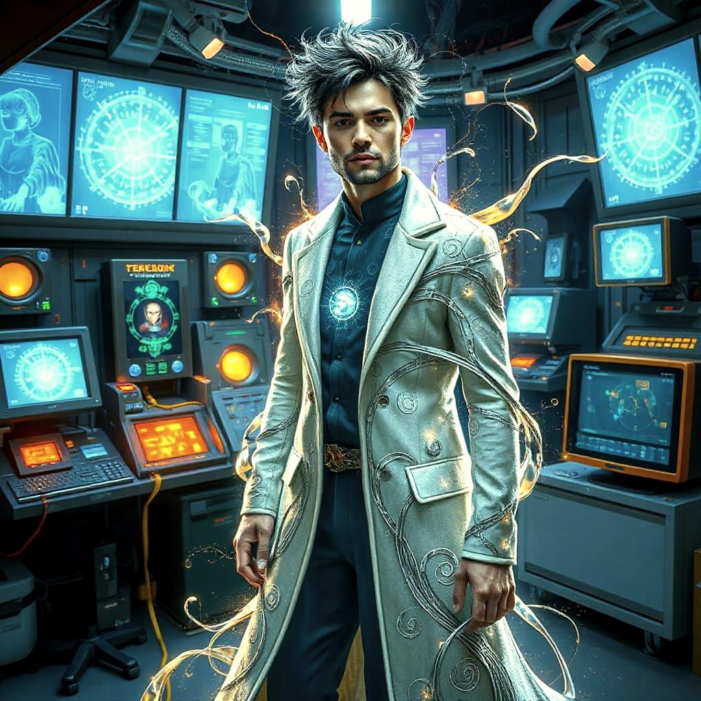 This image shows a handsome quantum spirit in a hi-tech laboratory. The figure has spiky hair of energy and eyes that suggest infinite possibilities. The image has an art nouveau style with intricate details and flowing lines.