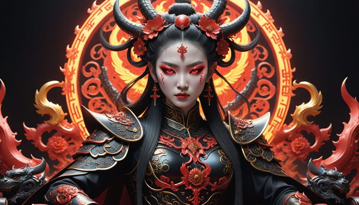 A striking picture of a majestic demon queen on a throne. The digital artwork features a gothic-Chinese design with cool moonlight, phoenix motifs, and rich textures.