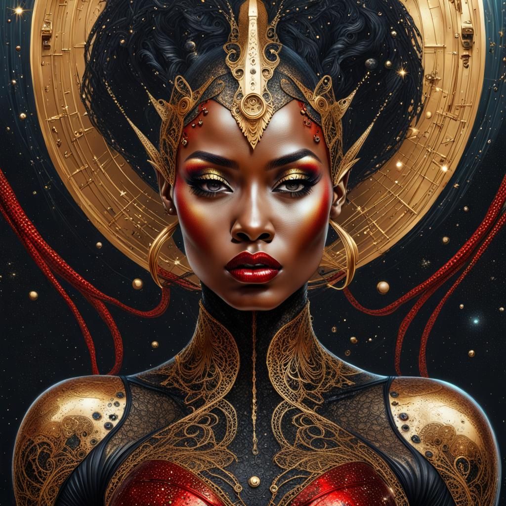 A hyperrealistic portrait of a beautiful Black woman in gold and red latex lingerie. The subject's head melts into a spaceship, rendered with sparkling details in a fantasy art style.