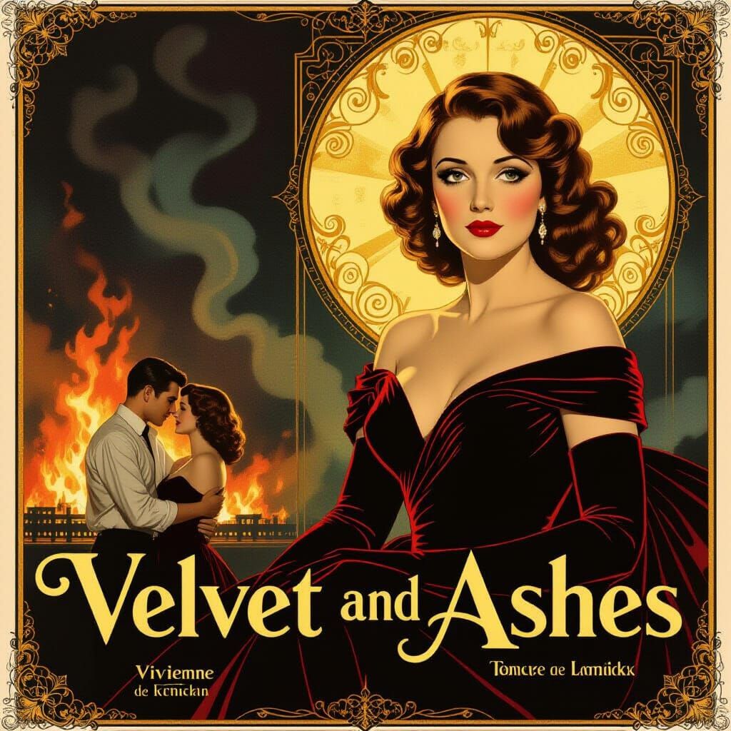 A vintage movie poster depicting a glamorous woman in a red velvet dress above a smaller romantic scene. The poster features art deco elements, painterly shadows, and a dramatic burning theater backdrop.