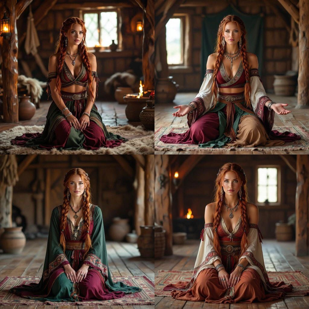 A woman with Indigenous features and red hair kneels in a rustic Viking hall, adorned with braids and silks. Warm light illuminates the serene scene.