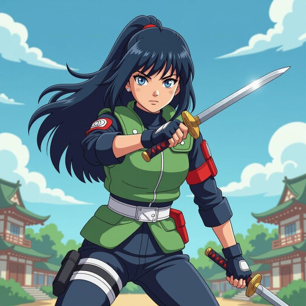 This image shows Hinata Hyuuga, a kunoichi in a ninja outfit, in a dynamic action pose. The image is inspired by retro-futuristic styles, reminiscent of Filmation, with vibrant colors.