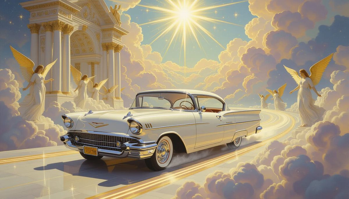 This baroque oil painting captures a pearlescent Chevrolet Opala drifting on a road of light through heavenly clouds, with golden angels observing. Luminous trails and divine light beams enhance the sacred, serene atmosphere.