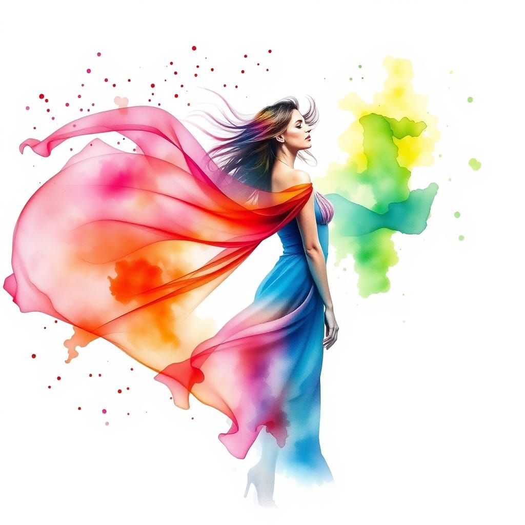 This image shows a beautiful woman in a dynamic display of vibrant watercolor colors that fade into a white background.