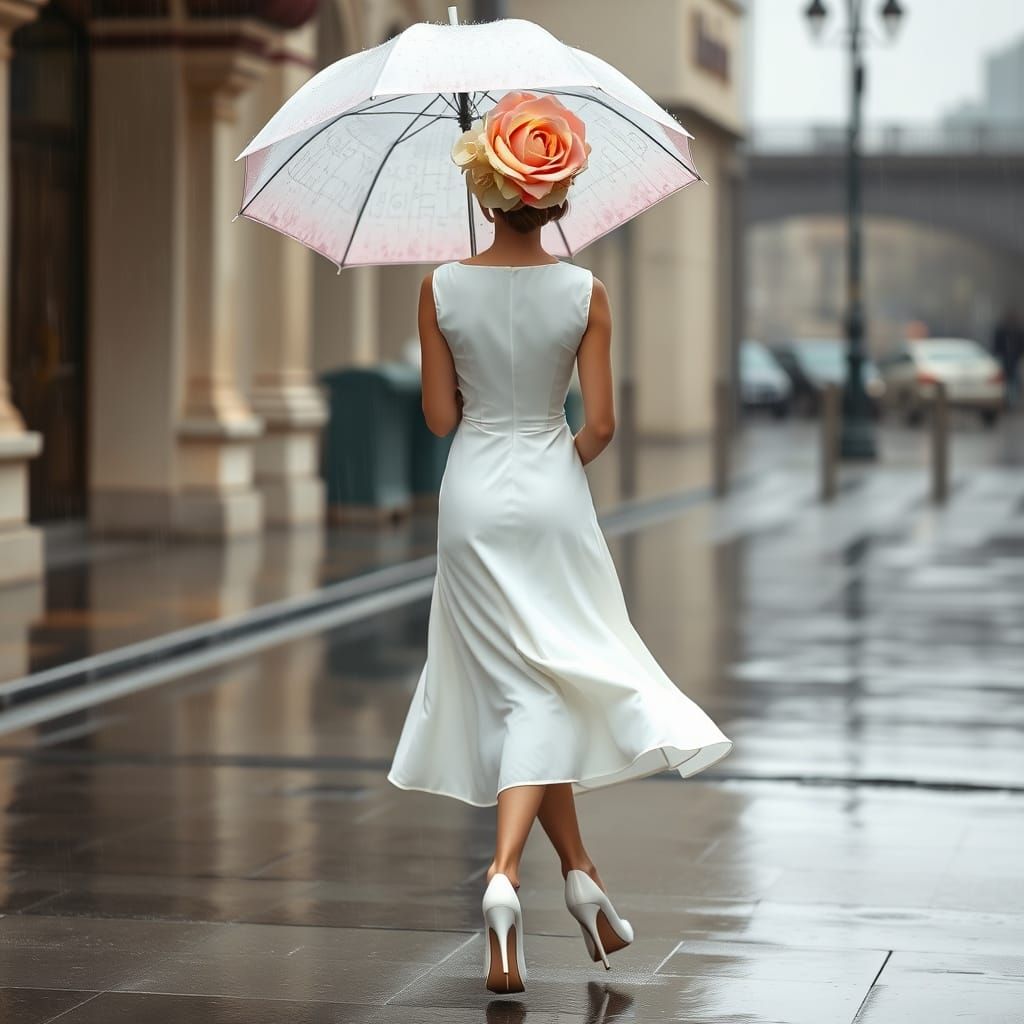 This image shows a beautiful woman walking down a wet street, dressed in a flowing white gown and holding a delicate umbrella, set against a softly blurred background reminiscent of a rainy day in a minimalist impressionist style.