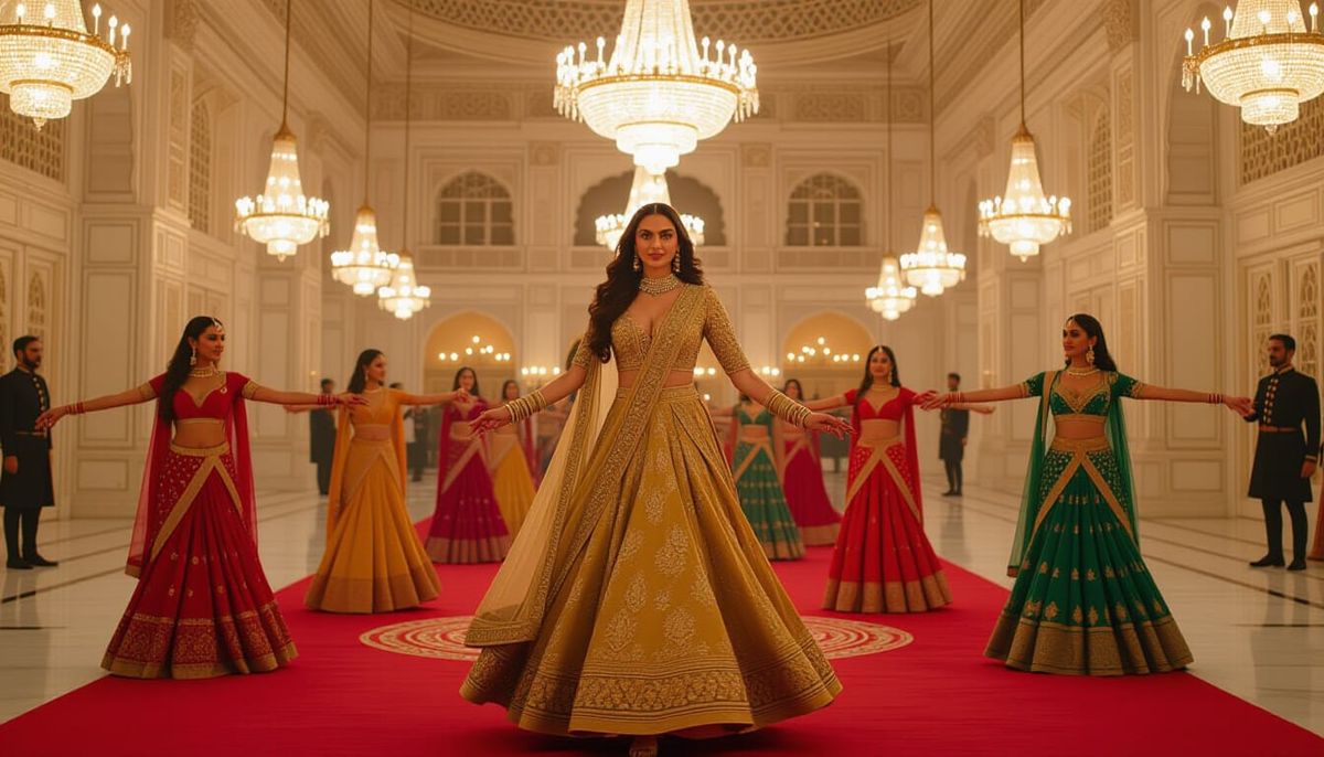 A cinematic image shows Deepika Padukone in a gold dress leading dancers in a Mughal palace. This vibrant scene evokes Bollywood with dramatic lighting and intricate details.