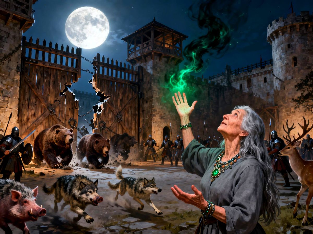 This photorealistic image depicts a medieval prison at night under a full moon, with a massive herd of wild animals ramming the wooden gates. An old woman casts dark green magic, while soldiers prepare inside.