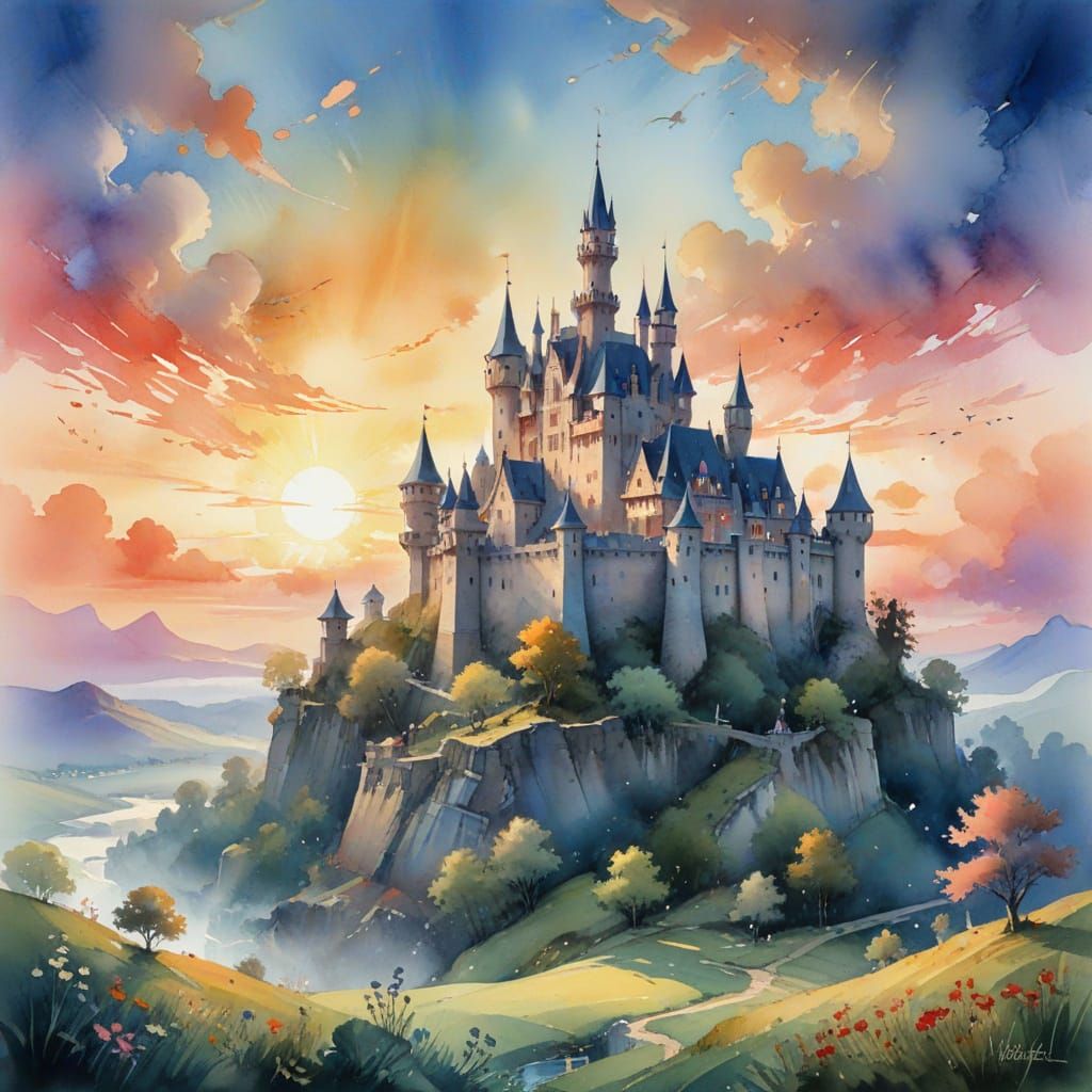 This image showcases a fairytale castle at dawn in a watercolor style, featuring ethereal light and whimsical details. The artwork blends expressive watercolor techniques with cinematic stylization.